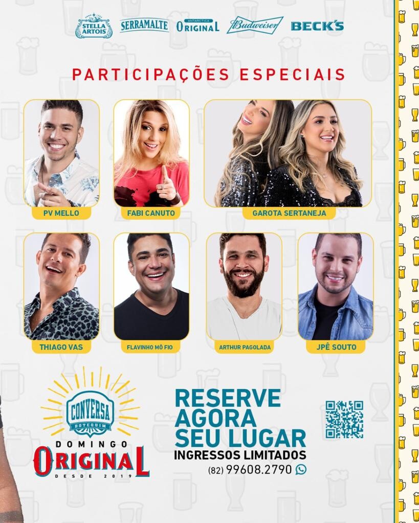 O público, que já conhece a animação que toma conta das noites do Domingo Original, vai poder ver, num só palco, os principais músicos que já se apresentaram no Conversa Botequim ao longo desses três anos. Serão 10 atrações, entre shows e participações especiais. O evento reunirá grande line up, passando por Bruninho, Toninho Cannibal, PV Mello, Flavinho Mô Fio, Garota Sertaneja, Pagode do Chocolate, Thiago Vas, Dj Pitão, Pagolada, Jpê Souto, Fabi Canuto, Tarcísio Viturino e muito mais.