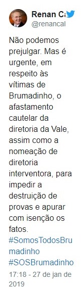 "Não podemos prejulgar. Mas é urgente, em respeito às vítimas de Brumadinho, o afastamento cautelar da diretoria da Vale, assim como a nomeação de diretoria interventora, para impedir a destruição de provas e apurar com isenção os fatos", afirmou Renan na publicação.