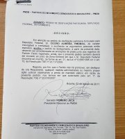 Além de pedir sua desfiliação ao PMDB, Cícero Almeida anexou um documento [foto abaixo] assinado pelo senador Romero Jucá (RR), atual presidente nacional do partido, que garante que não será feita contra ele [Almeida] qualquer medida administrativa ou ação para tirar o mandato, em virtude da desfiliação. O novo partido de Almeida deve ser o Podemos, antigo PTN, mas ainda não está confirmada se realmente o ex-prefeito realmente vai pra esse partido, apesar de declarações suas de esse será seu destino.