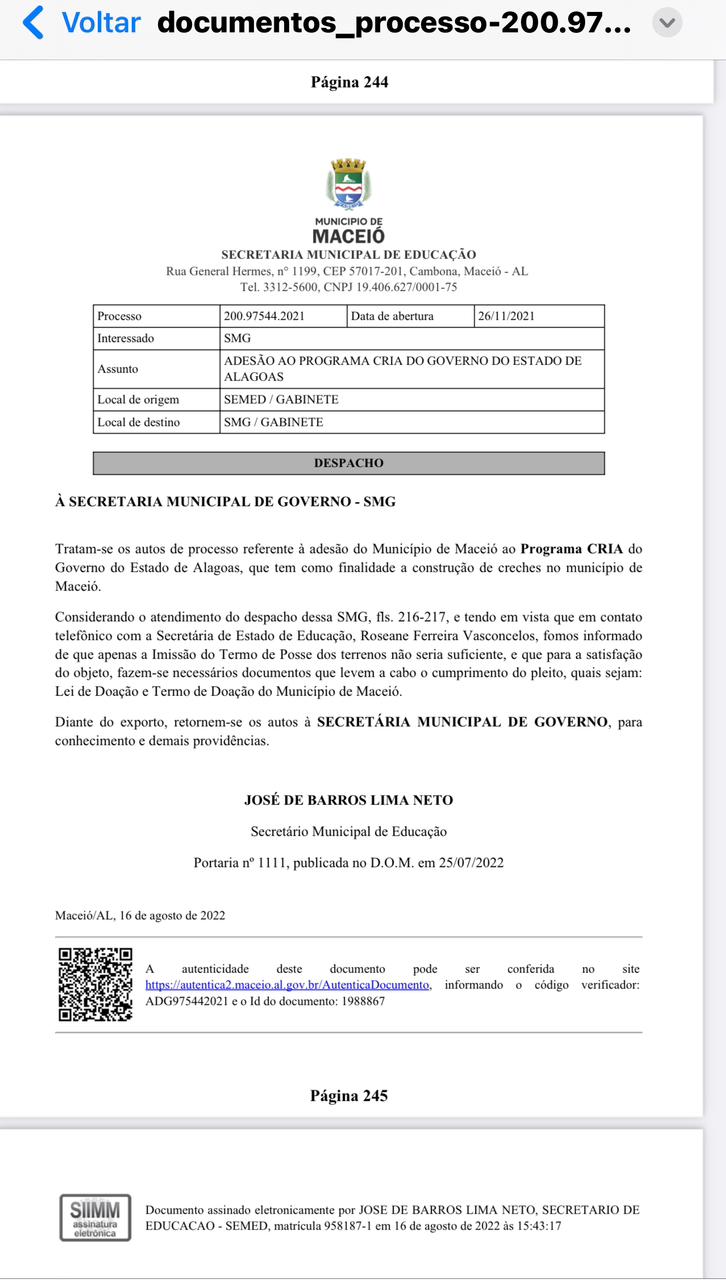 O processo que conta essa história tem 251 páginas, com estudos sobre as áreas disponibilizadas, geolocalizações e tratativas internas para que os terrenos fossem disponibilizados o mais breve possível, diante de um déficit de creches que alcança 29 mil crianças na capital alagoana.