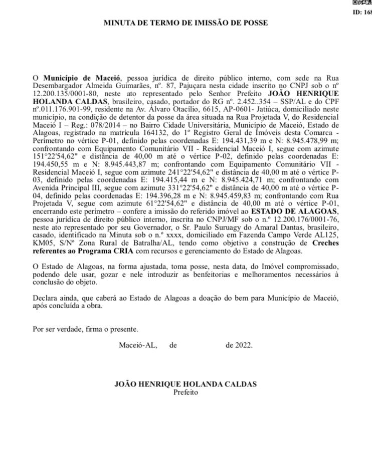 Cada terreno conta com um documento de imissão de posse que seria assinado entre o prefeito JHC e o então governador, Renan Filho. Seria improvável, porque os dois – enquanto prefeito e governador, jamais permitiram o aperto de mão – um do outro.