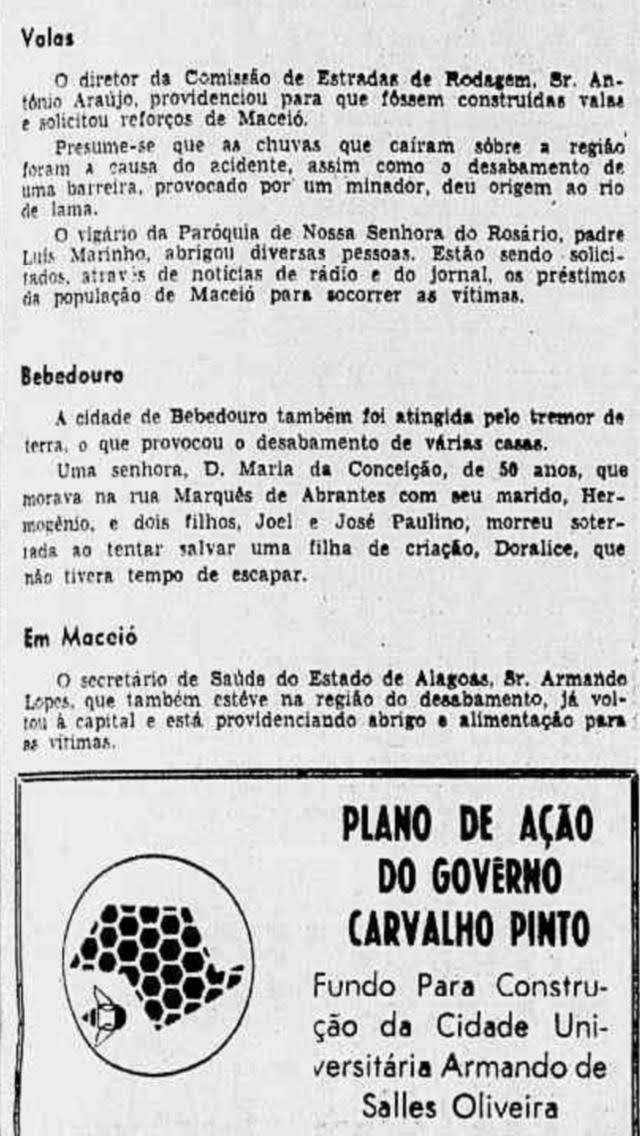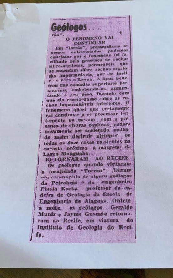 O jornal retrata que os geólogos Geraldo Muniz e Jayme Gusmão, do Instituto de Geologia do Recife, estiveram em Alagoas e “constataram que o fenômeno foi facilitado pela presença de rochas sílico-argilosas” e que “o fenômeno certamente vai continuar e se processar lentamente ou mesmo com a presença de chuvas copiosas, podendo novamente ser acelerado, chegando a destruir casas”.