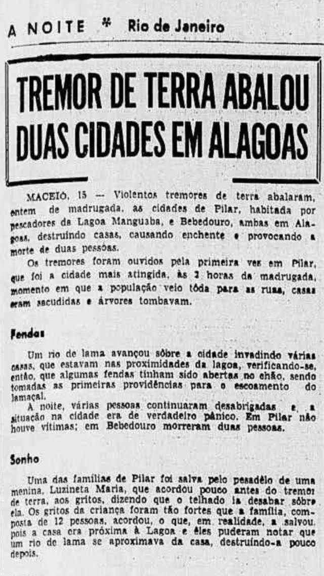 Pilar, que fica à margem da laguna Manguaba, foi a mais atingida. “Um rio de lama avançou sobre a cidade, invadindo casas que estavam nas proximidades da lagoa, provocando enchente nas ruas e a destruição de casas”. É o que diz a publicação do Jornal A Noite, do Rio de Janeiro, destacando que fendas haviam sido abertas no chão. “Em Pilar não houve vítimas; em Bebedouro morreram duas pessoas” (Maria da Conceição, de 50 anos e sua filha, Doralice).