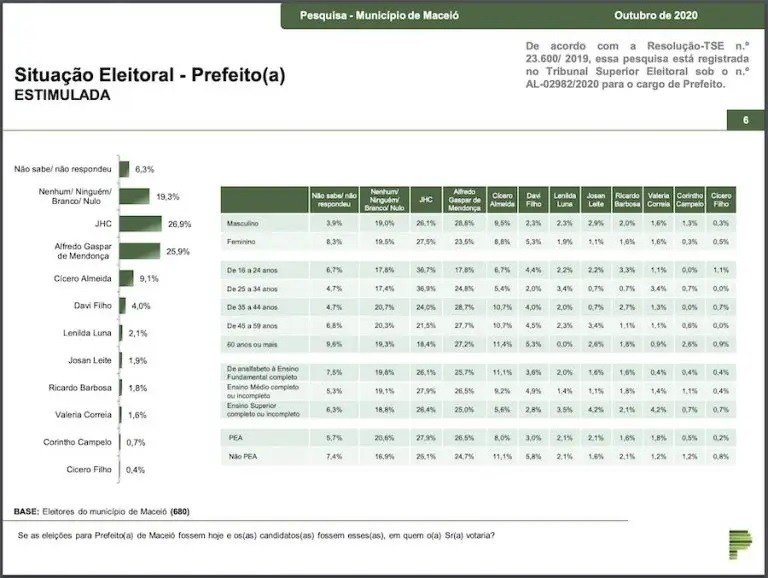 A pesquisa está registrada no Tribunal Superior Eleitoral sob o nº AL-02982/2020.