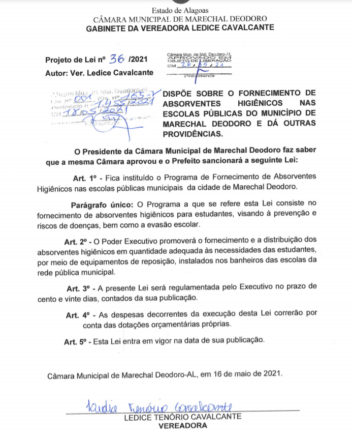Bem, o PL 36/2021 dispõe do fornecimento de absorventes higiênicos nas escolas da rede municipal de Marechal Deodoro. A defesa do projeto se baseia no auxílio às alunas carentes que, em tese, muitas vezes a família não tem dinheiro para comprar o produto. Projeto com a mesma finalidade, de autoria da vereadora Silvania Barbosa, foi aprovado na Câmara de Maceió.