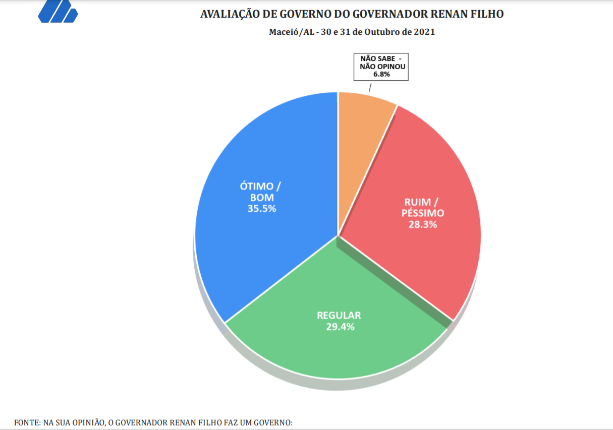 Já Renan Filho, mesmo com inúmeras realizações em diversas áreas, tem o governo aprovado por 51%. Os que desaprovam representam 39% e 10% não opinaram.