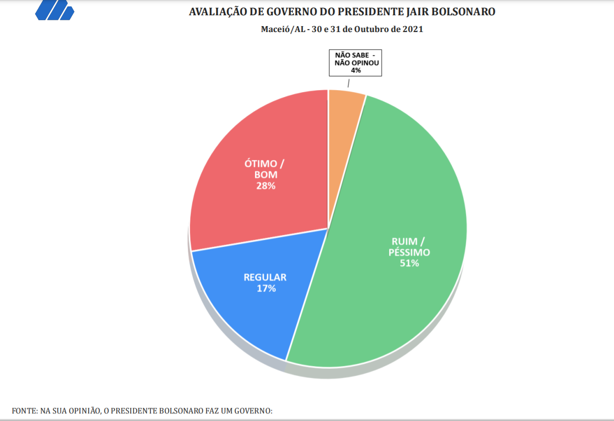 O presidente Jair Bolsonaro tem o governo desaprovado por 57,7% dos maceioenses. 36,7% aprovam e 5,6% não sabem ou não opinaram.