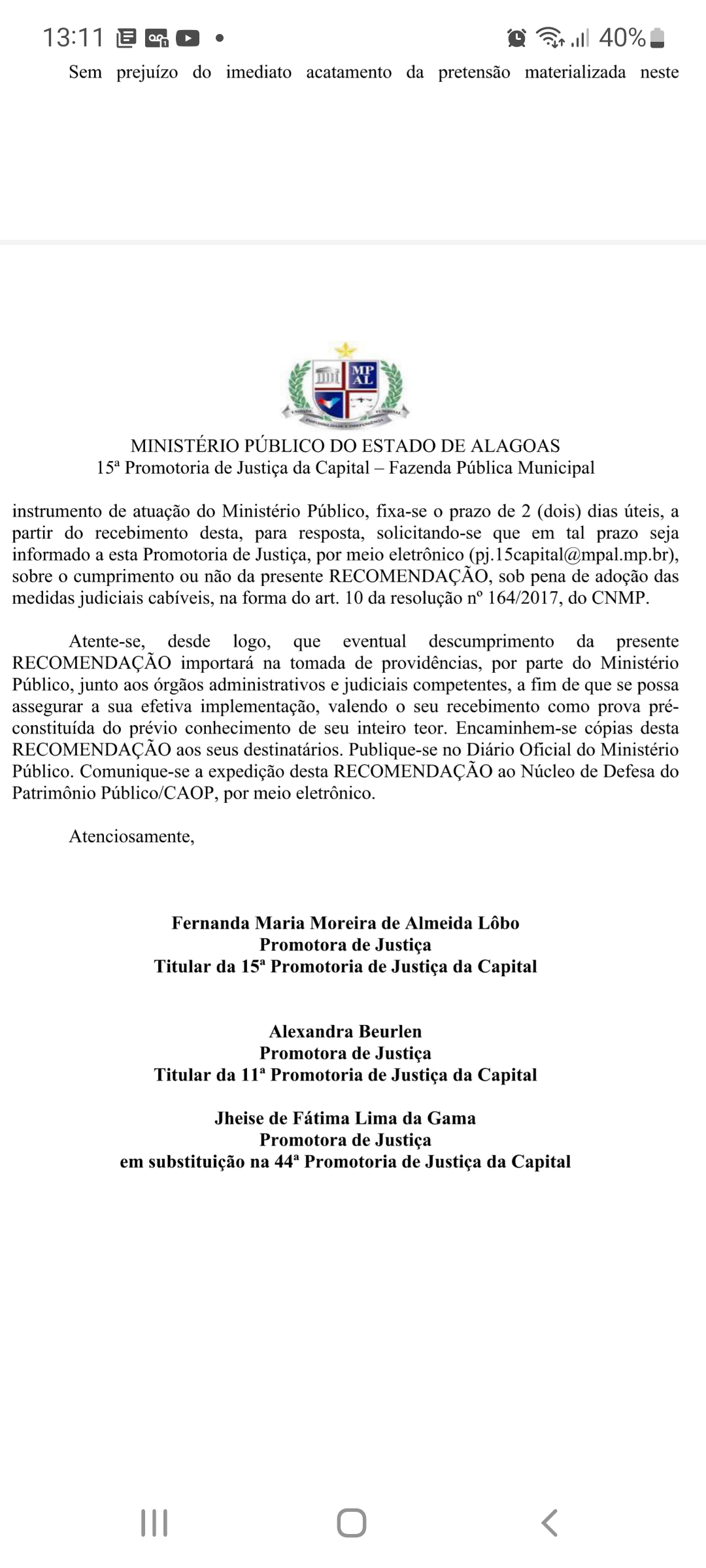A recomendação do MPE para a suspensão dos festejos juninos da capital foi assinada pelas promotoras Alexandra Beurlen, da 11ª Promotoria de Justiça da Capital, Jheise de Fátima Limada Gama, promotora substituta da 44ª Promotoria da Capital e Fernanda Maria Moreira de Almeida Lôbo, da 15ª promotoria de Justiça da Capital.