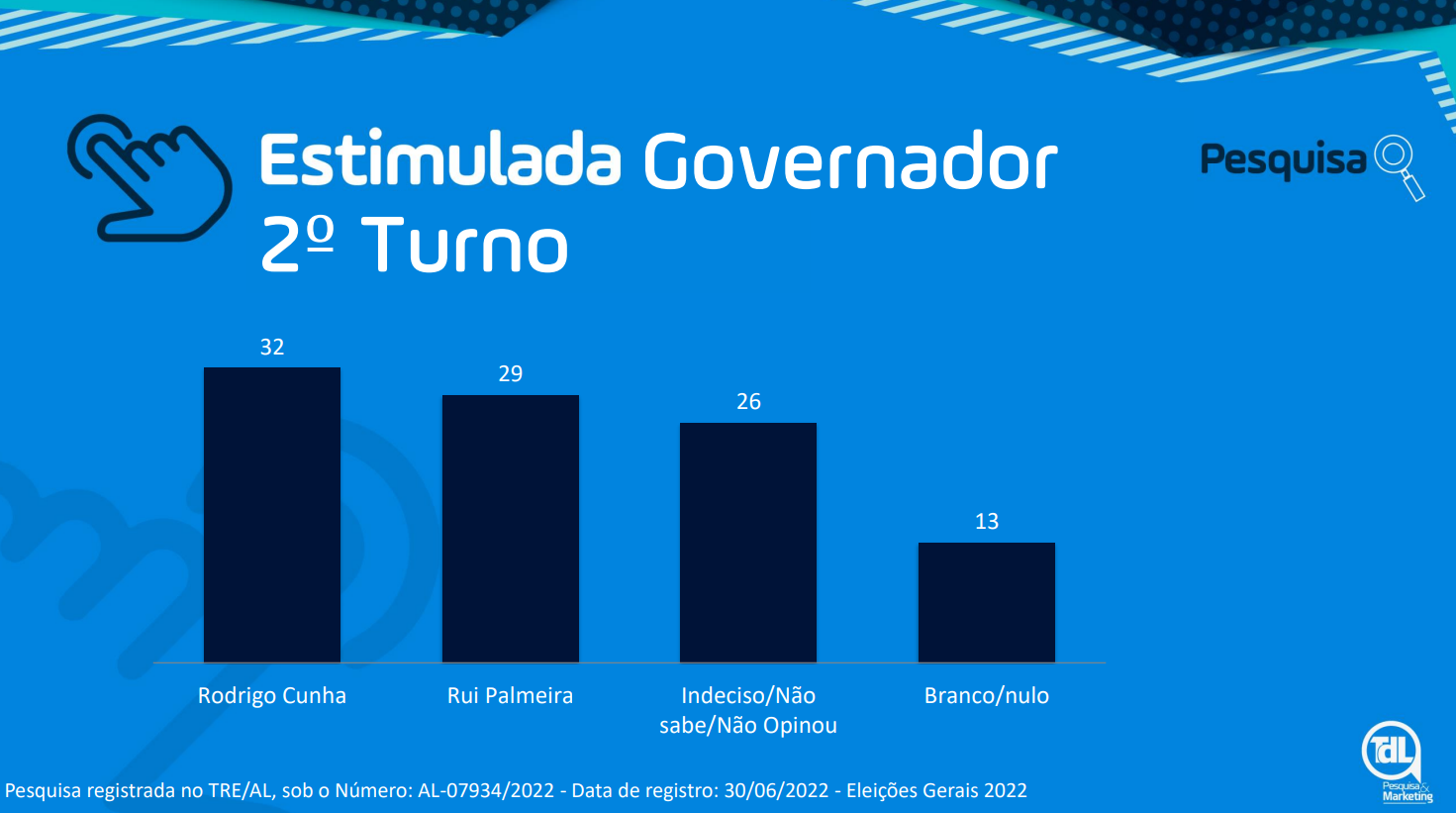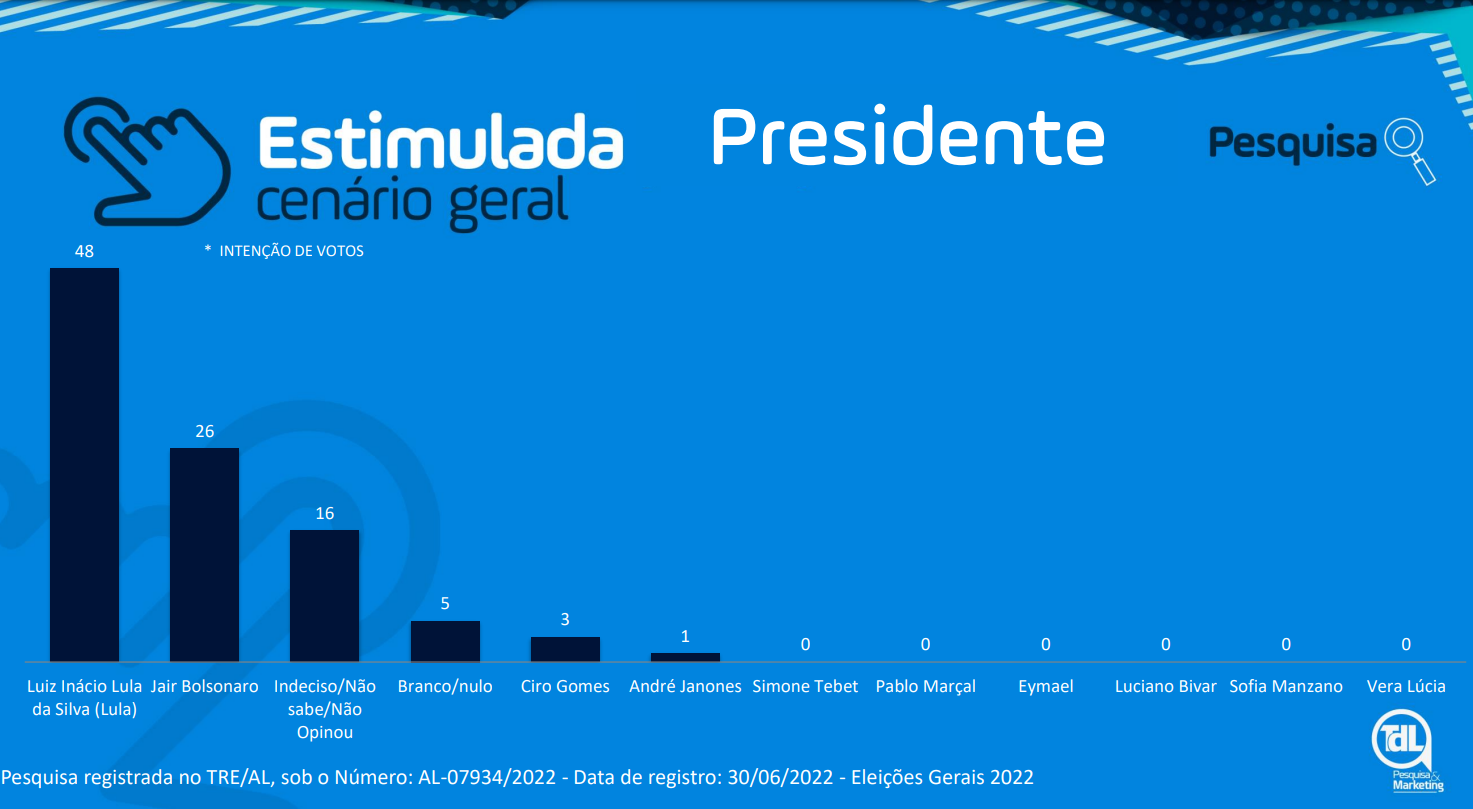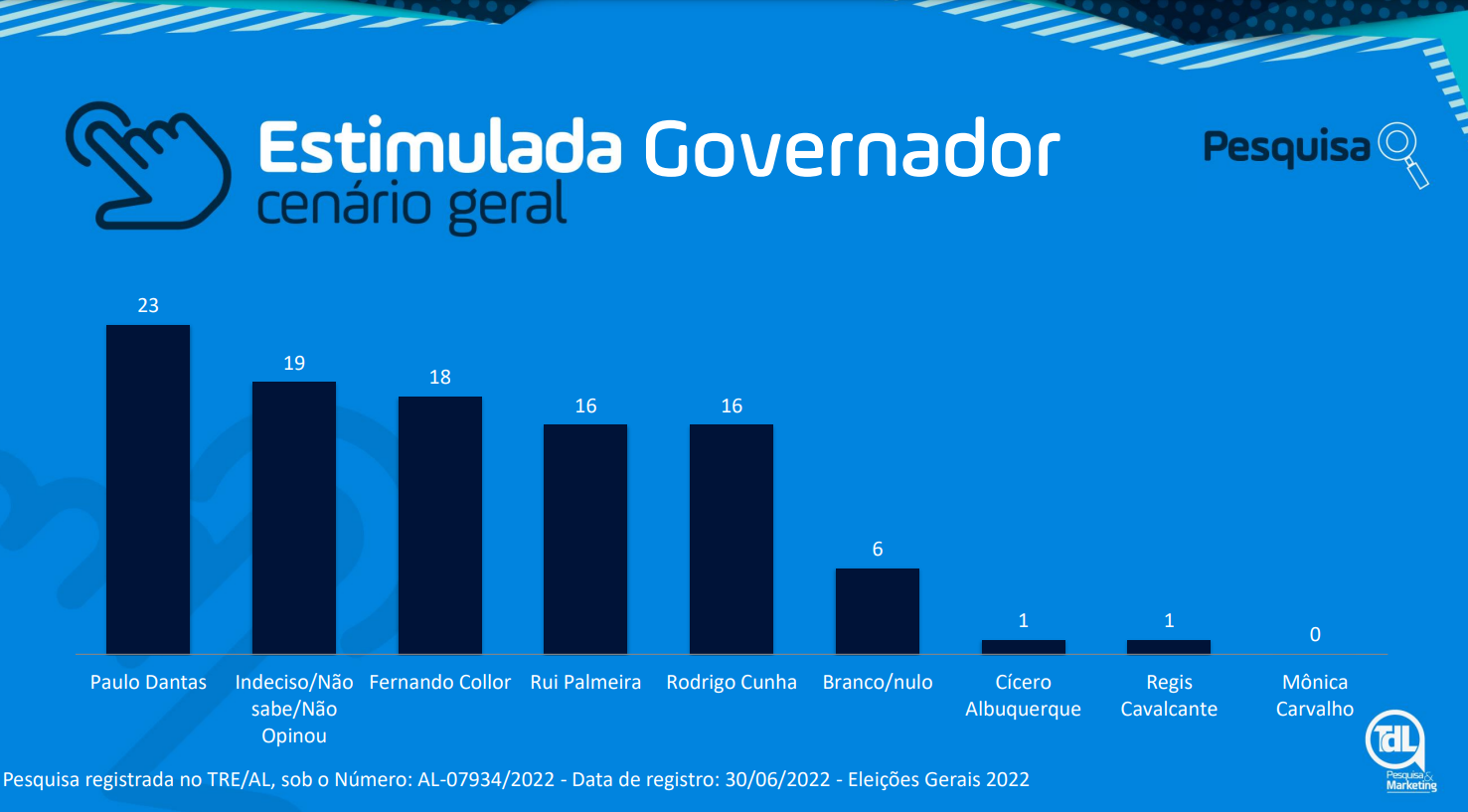 O TDL ouviu 1067 eleitores, entre os dias 02 a 04 de Julho. A margem de erro é de 3% e o intervalo de confiança de 95%. A pesquisa está registrada no TRE-AL, sob número AL07934/2022.