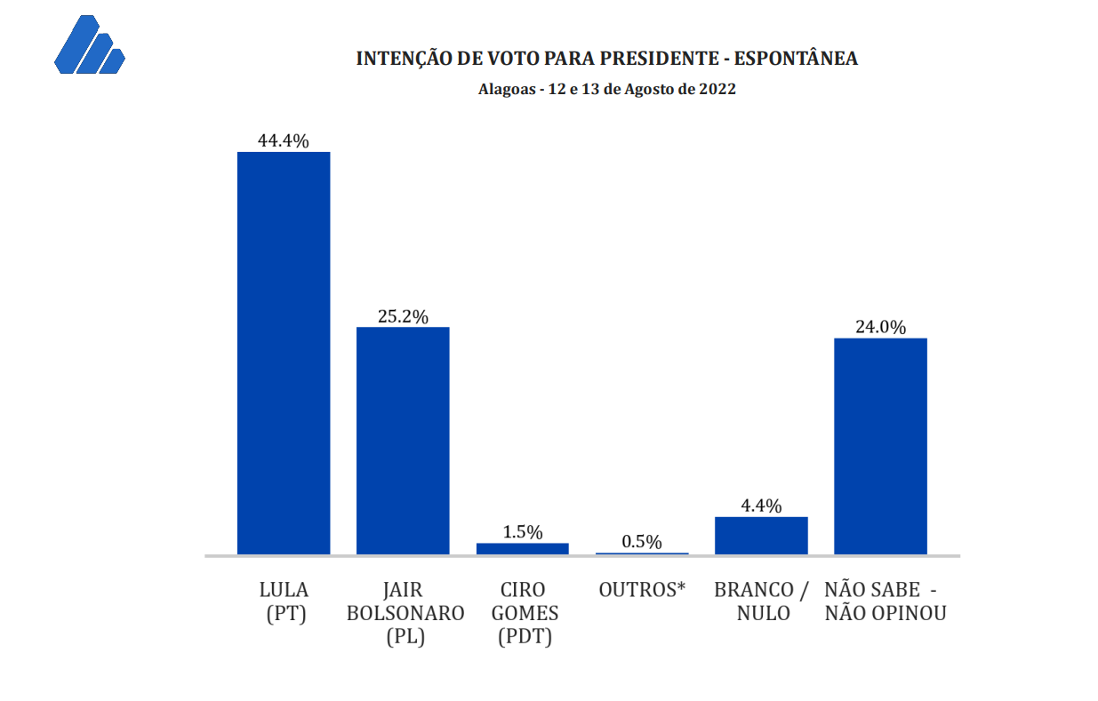 Já para presidente da República o percentual cai para 24%. Ou seja: a polarização nacional entre Bolsonaro e Lula não atinge Alagoas. Os números dizem muita coisa. É preciso prestar a atenção nisso.